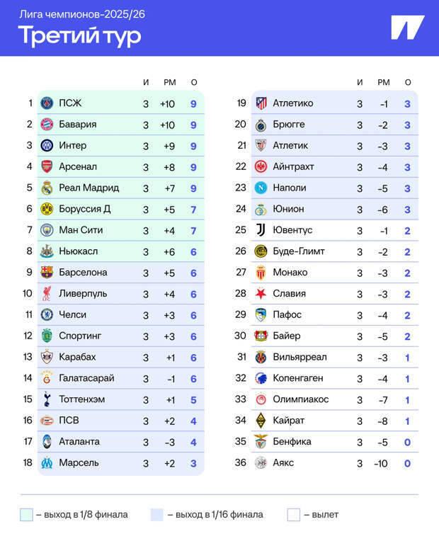 Самое яркое во второй день третьего тура Лиги чемпионов. Сначала взглянем на таблицу: